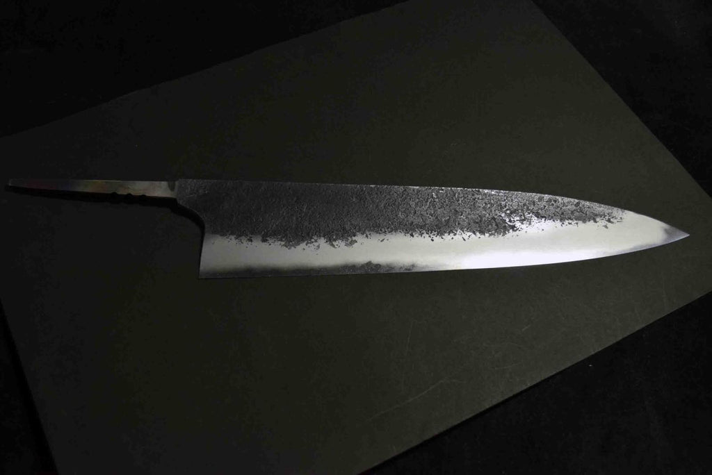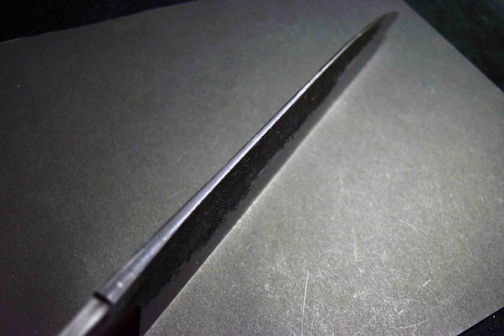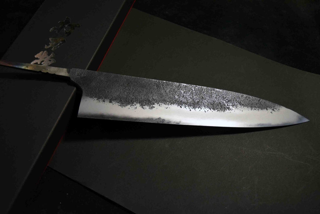 Mazaki's quenching technique is advanced, yielding excellent edge retention and sharpness, he forge-welds all of his carbon steel knives in house, and finishes his bevel with a variety of different whetstones, all by hand. Mazaki works prefers the more traditional Shirogami #2 and Aogami to craft his knives, and leaves a rustic finish on many of his blades. The bevels are finished by hand on his whetstones to ensure an even grind and geometry. Lightly convexed bevels and very thin behind the cutting edge.-This Aogami Super, as is well known, has a high hardness of HRC 65-67 and excellent wear resistance while maintaining a certain level of toughness.
