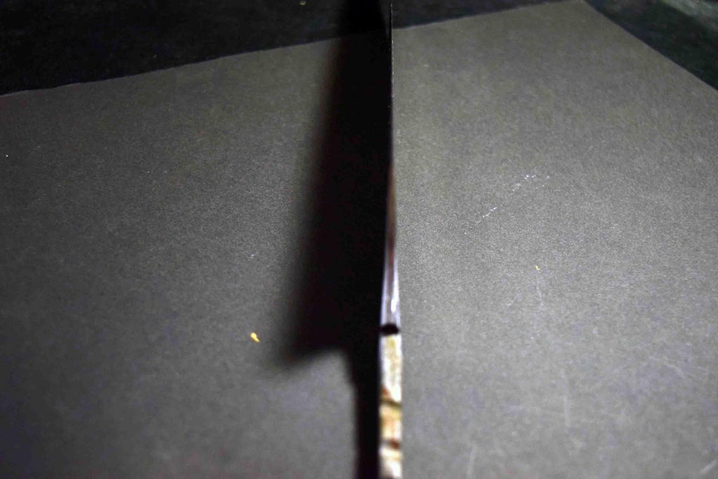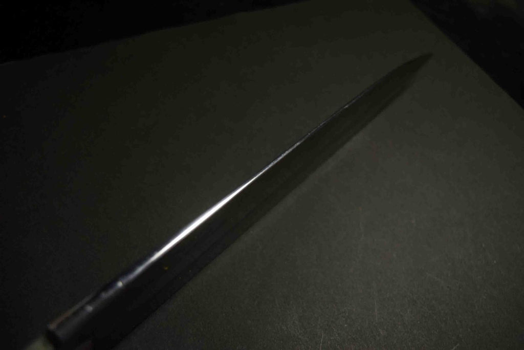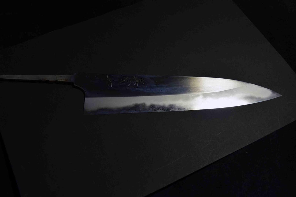 Mazaki's quenching technique is advanced, yielding excellent edge retention and sharpness, he forge-welds all of his carbon steel knives in house, and finishes his bevel with a variety of different whetstones, all by hand. Mazaki works prefers the more traditional Shirogami #2 and Aogami to craft his knives, and leaves a rustic finish on many of his blades. The bevels are finished by hand on his whetstones to ensure an even grind and geometry. Lightly convexed bevels and very thin behind the cutting edge.-This Aogami Super, as is well known, has a high hardness of HRC 65-67 and excellent wear resistance while maintaining a certain level of toughness.