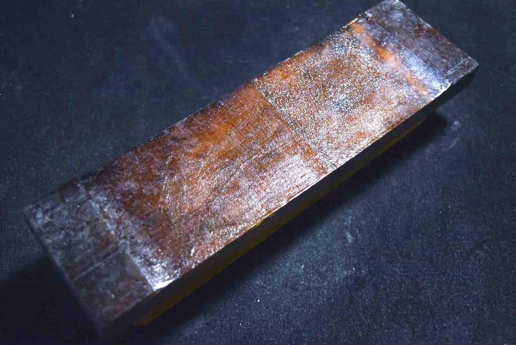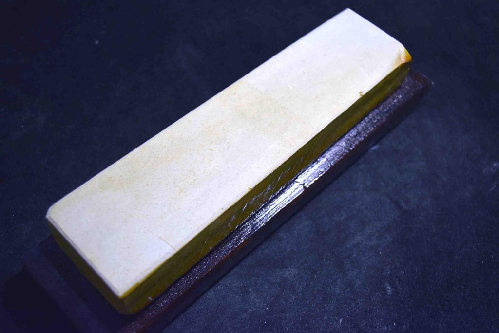Ozaki Hachimai Layer, we bought it from a domestic collector.The Hachimai layer is positioned in the upper to mid levels of the Ozaki mountain stratigraphy, lying between the Tenjo-Suita layer of the Honkuchi-nari formation and the Senmai layer. This layer shares characteristics similar to Tomae stones and is highly regarded for finishing applications. Steel swarf releases cleanly, allowing the sharpener to read the condition of the edge accurately, resulting in confident, hesitation-free finishing work. The sharpening feel remains smooth throughout the process, making this stone well suited for knives, tools, and straight razors, especially for users who prioritize reliable sharpness and edge longevity. A truly representative stone of Ozaki’s practical and performance-oriented character. Please note that these are not for beginner sharpeners since they're harder to use. These are natural stones meaning that every single one of them are different so my measured sizes are not accurate. This is a lifetime investment for people who live sharpening their knives and tools, do not hesitate to ask me your questions.” Dimension : 53mm×207mm×28-30mm ( Approx.) Weight: 851g (Inc wooden base )