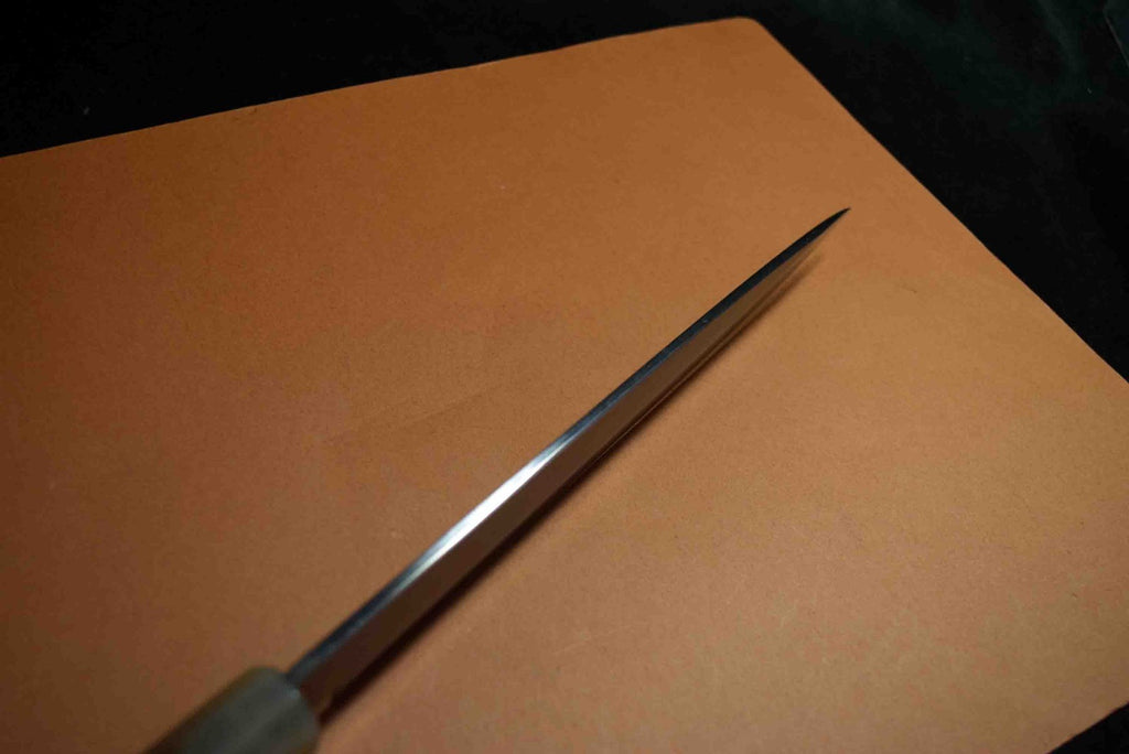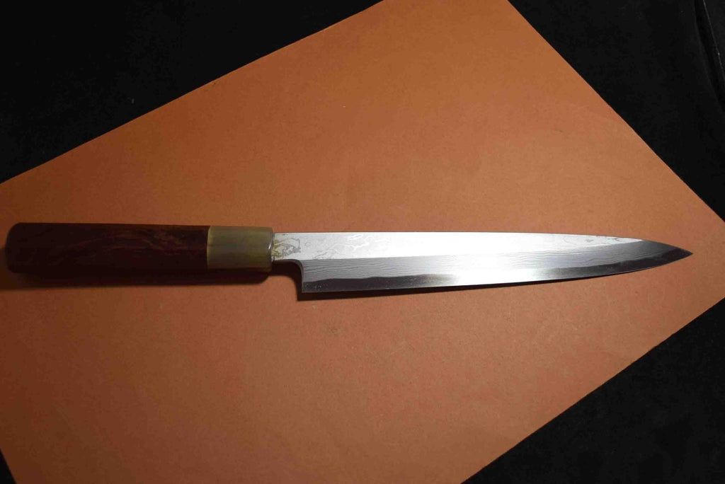 The blade has been sharpened by Naohito Myojin, one of Japan’s most respected sharpeners. Known primarily for his double-bevel work, and considering his current workload, this piece will likely be the last single-bevel knife he handles — making it an especially rare example of his craft. The edge bears his hallmark precision and beauty, with the choil carefully polished to perfection.